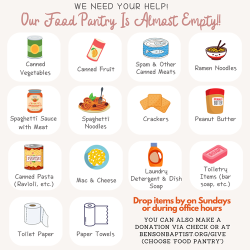 La Despensa de Alimentos Benson Baptist está disponible los 2nd & 4th martes de 1:00 p. m. a 3:00 p. m. y cada hogar puede visitarlo una vez en un período de un mes (30 días).