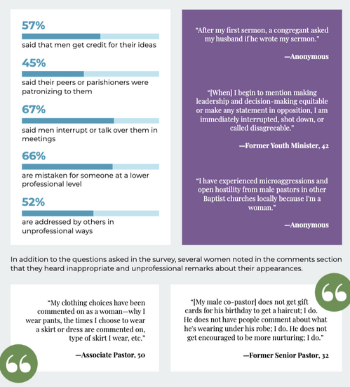 According the the BWIM State of Women in Baptist Life (2021), 86% of women have experienced obstacles in relation to their gender. 59% of women in ministry say they have been overlooked and silenced in their ministry settings. 63% of women in ministry have said they have had to fight for a place at the leadership table. More statistics in the report include:
